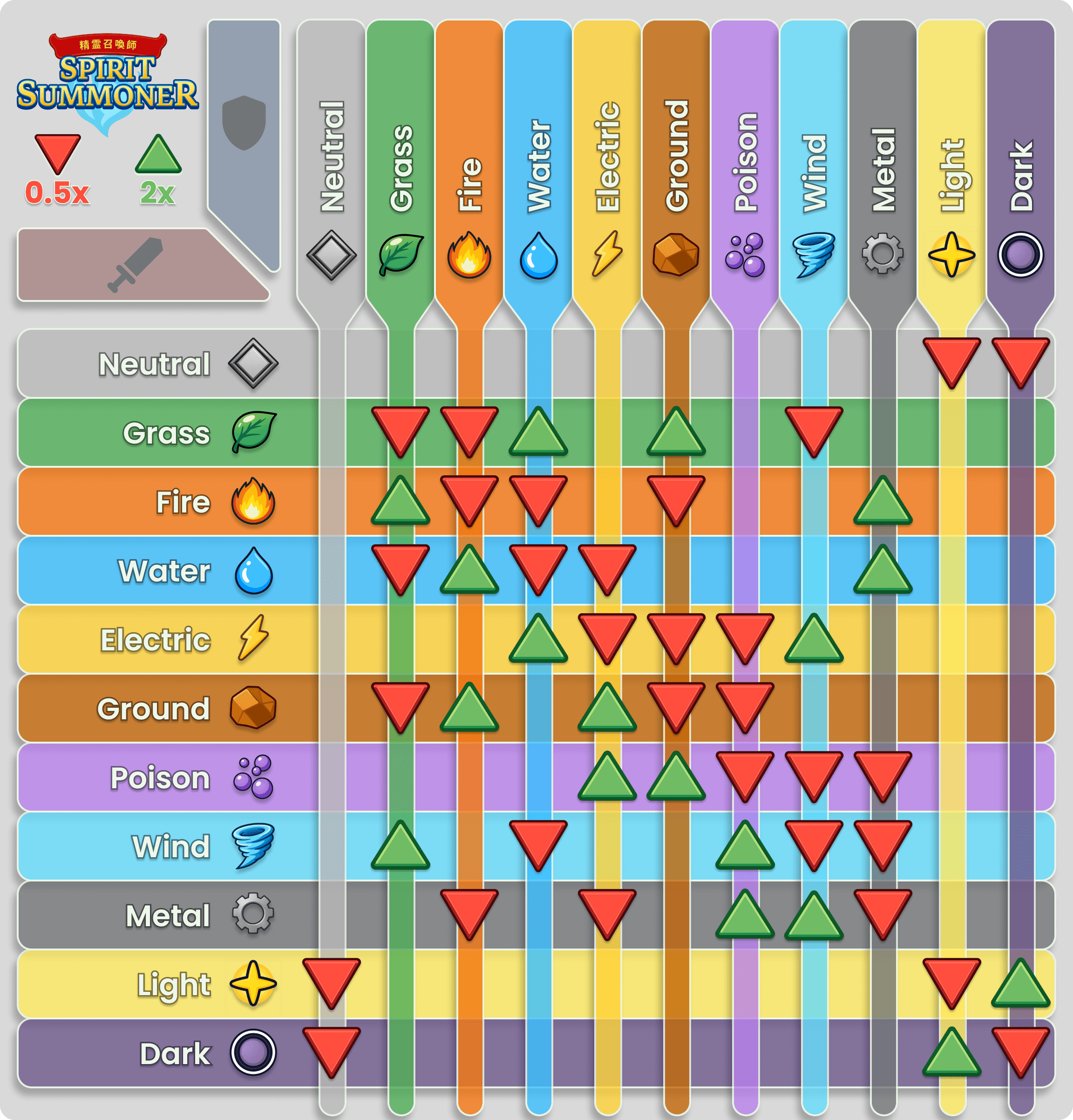 Spirits harness the power of 11 Core Elements—Water, Grass, Fire, Ground, Wind, Electric, Poison, Light, Dark, Metal, and Neutral.